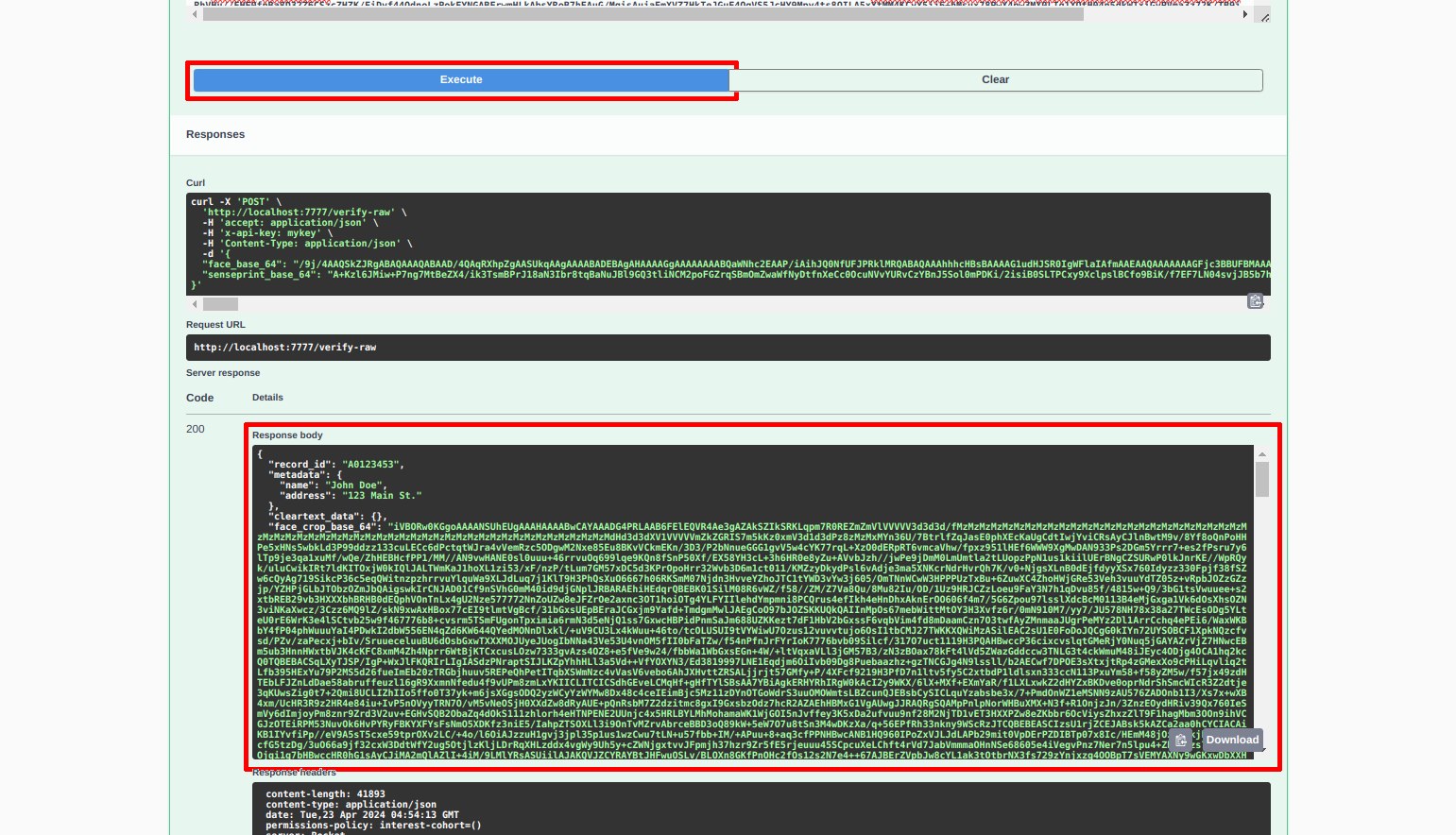 We post the minimal JSON shown below to perform decryption / verification of the raw SensePrint (please note, the value below will not work as SensePrints are tied to licences. You should use the values from your own invocation of the /senseprint-raw end-point in the previous step: