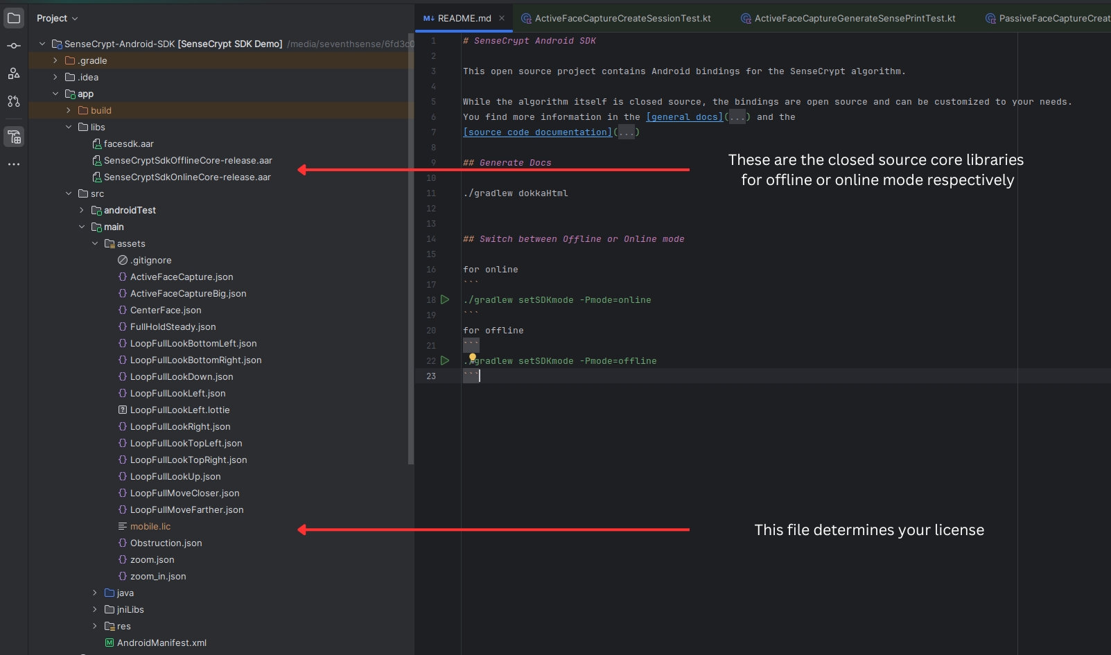 The Android SDK is located in the SenseCrypt-Android-SDKfolder. The following screenshot shows the location of the mobile.lic and closed source core SDK library in the reference UI application: