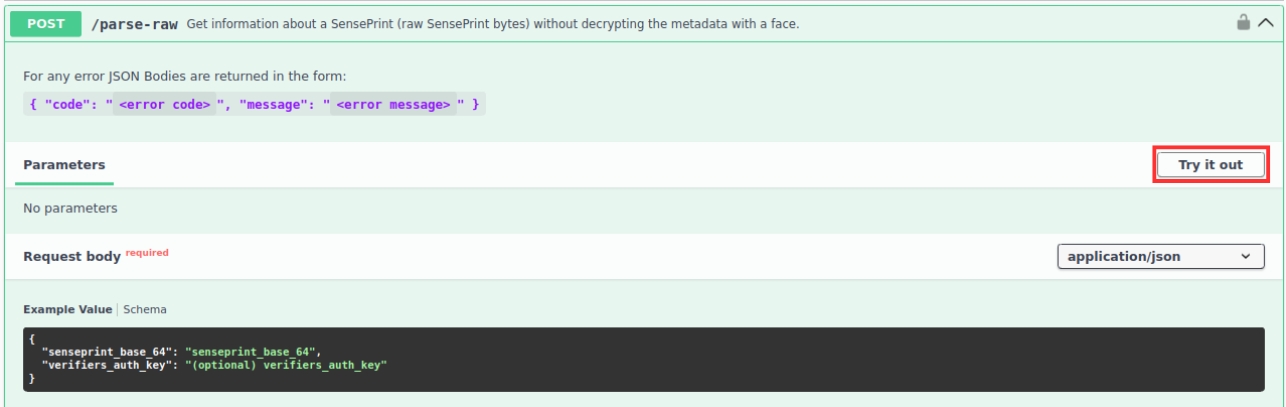 To parse raw SensePrint bytes, expand the /parse-raw section and click on Try it out as before:
