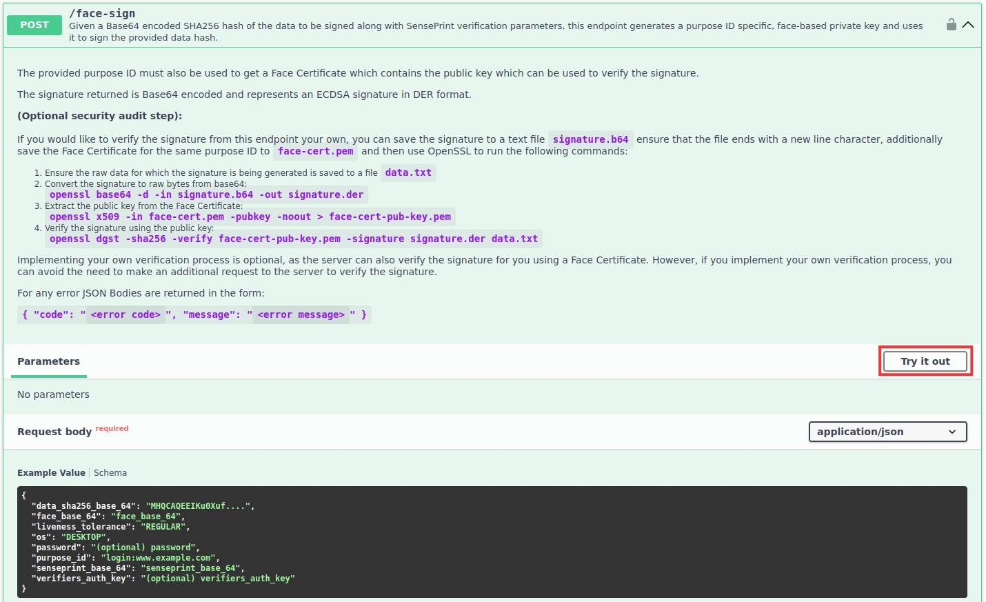 Expand the /face-sign section and then click the Try it out button as shown below: