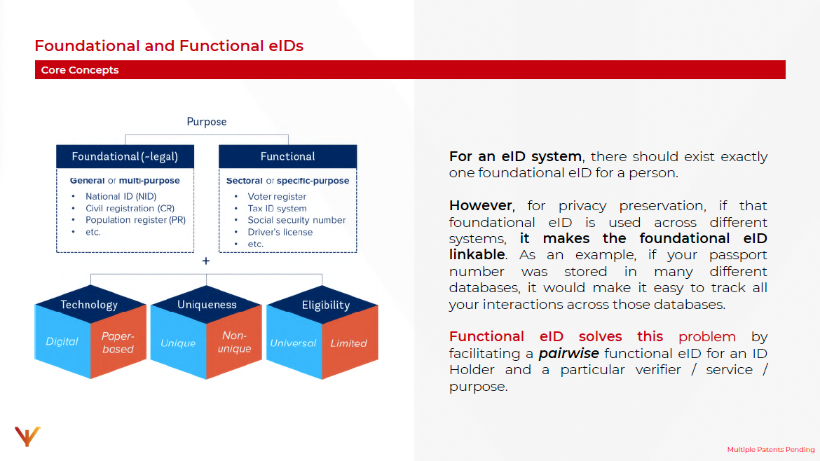 However, for privacy preservation, if that foundational eID is used across different systems, it makes the foundational eID linkable. As an example, if your passport number was stored in many different databases, it would make it easy to track all your interactions across those databases.