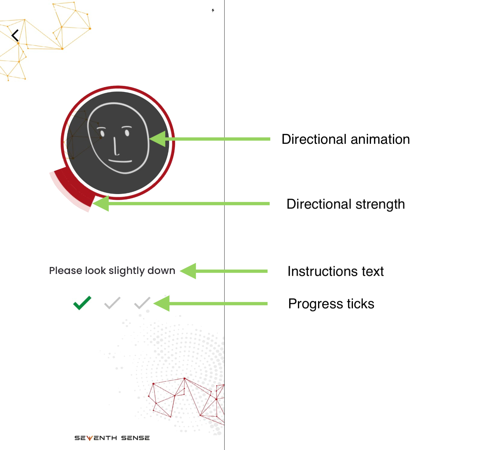 3. **Active Face Capture Result** : The SDK returns an **Active Face Capture Result** for each frame, which developers can use to update the UI. Basically, the UI needs to handle four components based on the result: expected user's facial direction, their current head position, animation status, and direction strength indicators. Developers can update the expected direction name in the text, show or hide animations, and display a direction strength indicator to guide the user to look in specific directions (e.g., bottom, left, up). These values should be continuously updated until the face scan is completed.