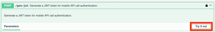 To generate a JWT, expand the /gen-jwt section and then click the Try it out button as shown below:
