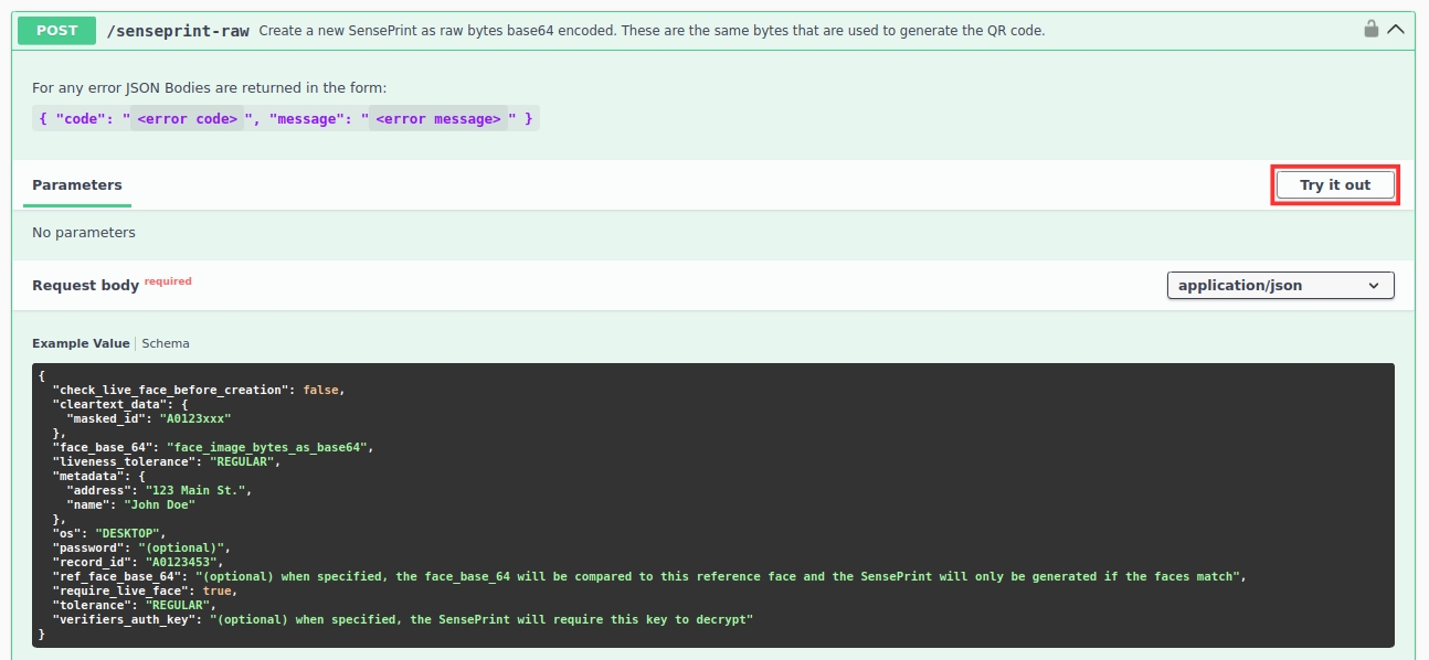 Expand the /senseprint-qr section and then click the Try it out button as shown below: