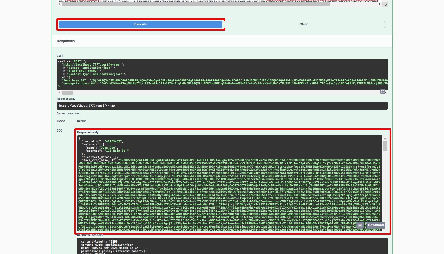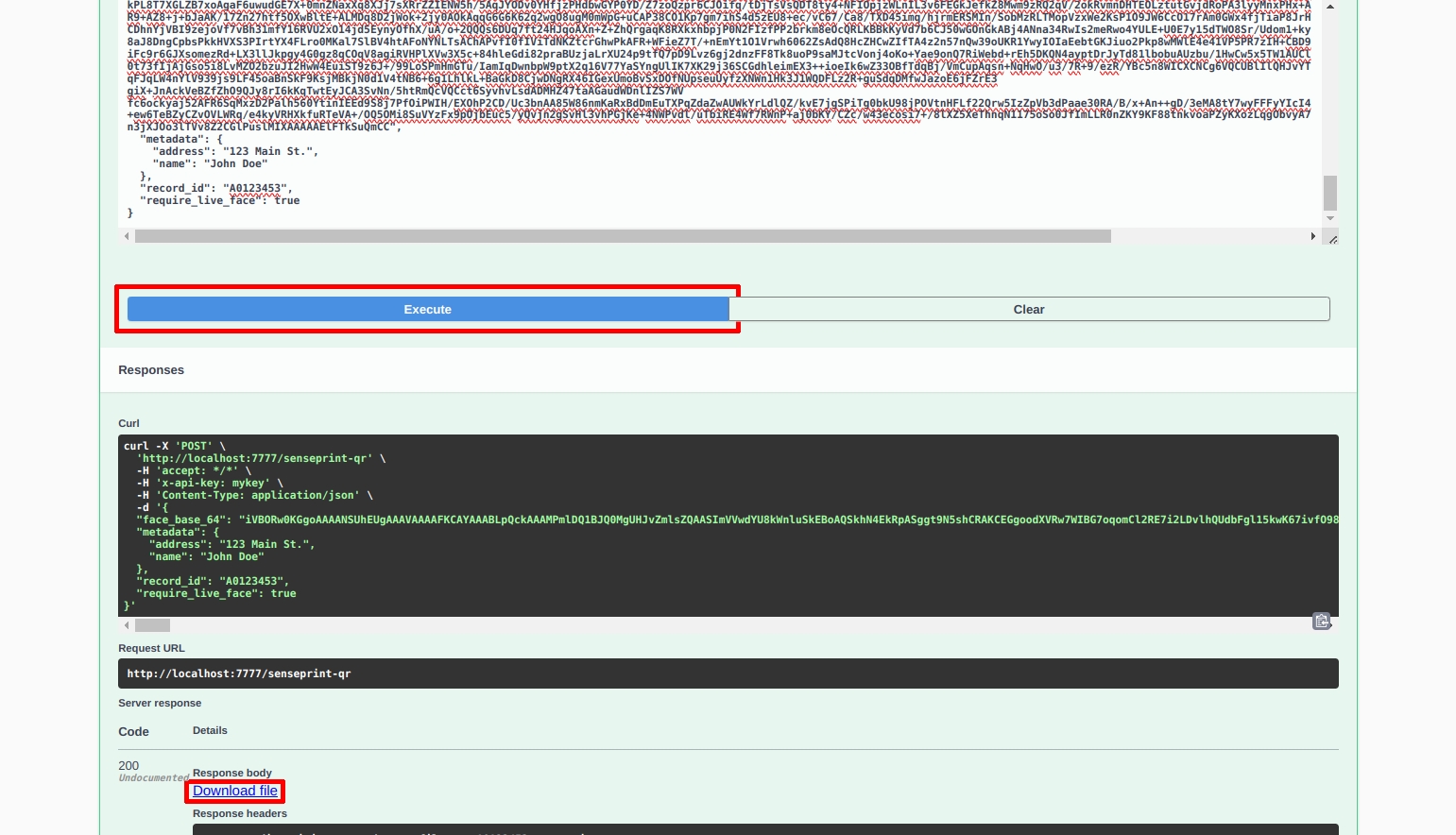 Upon clicking the Execute button, instead of a QR code to download, we will see the raw SensePrint bytes encoded as a Base64 string: