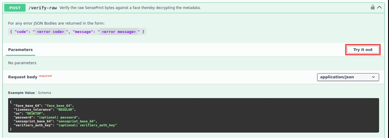 To decrypt the raw SensePrint bytes, expand the /verify-raw section and click on Try it out as before: